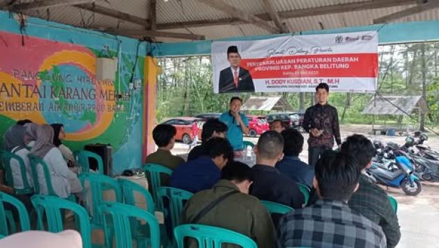 Merawang – Dalam semilir angin pantai Temberan, Desa Air Anyir, Kabupaten Bangka, Sabtu (24/05/2025), Ketua Komisi II DPRD Provinsi Kepulauan Bangka Belitung, Dody Kusdian mensosialisasikan Peraturan Daerah (Perda) Nomor 13 Tahun 2016 tentang Keolahragaan kepada mahasiswa dan masyarakat.