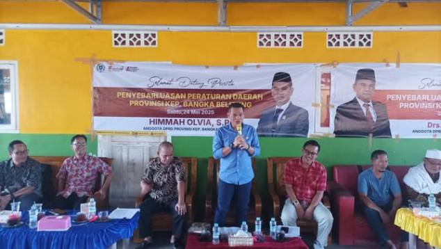 Mendo Barat - Wakil Ketua dan Anggota Komisi II DPRD Provinsi Kepulauan Bangka Belitung, Himmah Olivia dan Rustamsyah melaksanakan kegiatan penyebarluasan informasi Perda No. 13 Tahun 2017 tentang Pemberdayaan Koperasi dan UMKM serta Perda No. 19 Tahun 2019 tentang Penataan Usaha Perkebunan Kelapa Sawit di Desa Petaling, Kecamatan Mendo Barat, Kabupaten Bangka, Sabtu (24/05/2025).